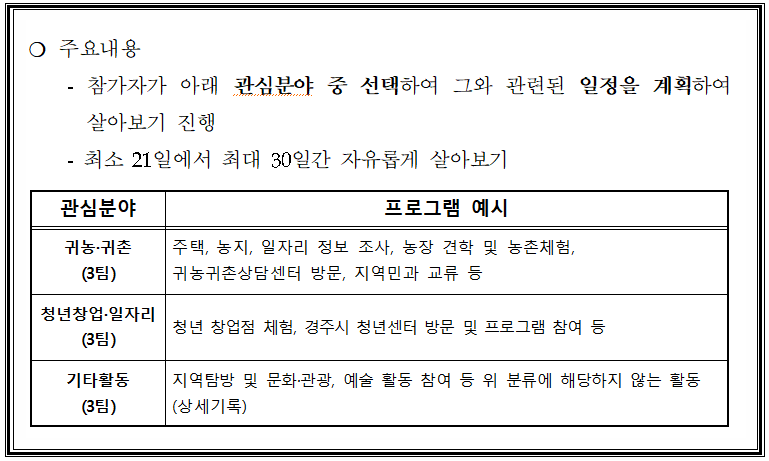 - 체류기간 중 참자가가 개인별 SNS에 1일 1건 이상 살아보기 후기 포스팅 작성 (모두공개해야 인정)