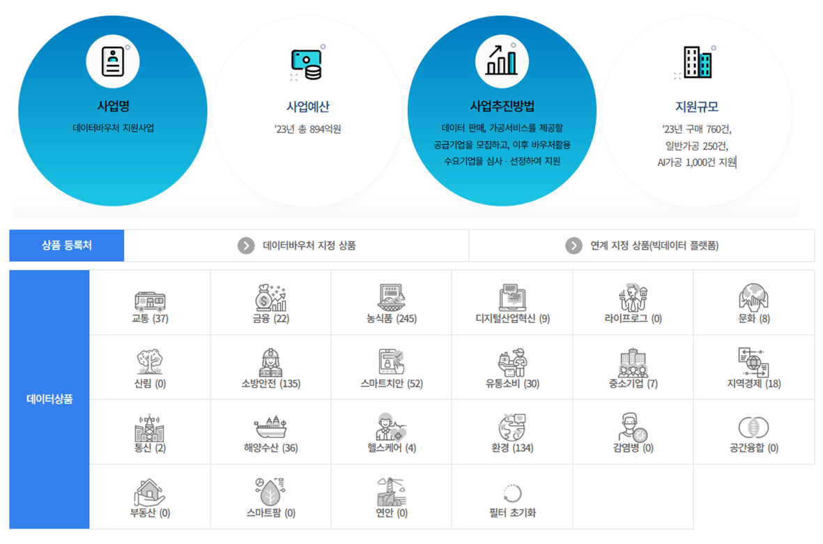 정부에서 데이터 활용에 어려움을 겪고 있는 사업자 대상으로 데이터 수요 공급 생태계 지원을 해주고 있습니다.