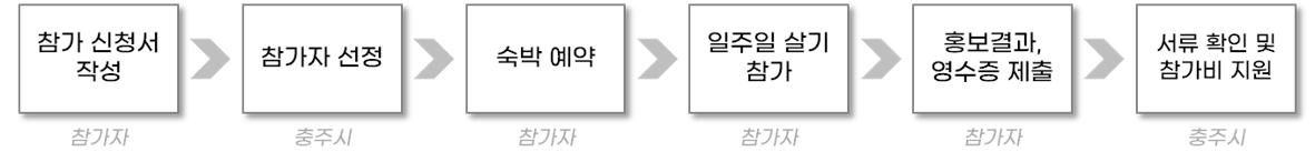 지원절차의 경우 아래와 같이 신청서 작성 후 선정이 되면 일주일 살기를 한 이후 홍보결과를 제출하고 최종 서류 확인되면 참가비를 충주시로부터 받게 되는 절차를 거치게 됩니다.