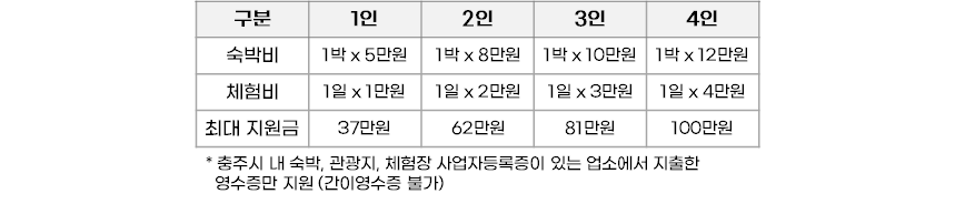아래 나온 내용 잘 보시고, 충주에서 좋은 경험도 하고 지원금 받아서 가성비 있게 즐기셨으면 좋겠습니다.