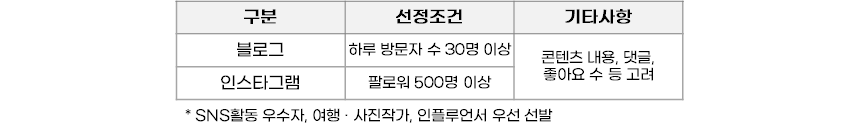 * SNS 활동 우수자, 여행 · 사진작가, 인플루언서 우선 선발 - 지원내용: 숙박비, 체험비 한도 내 실비지원