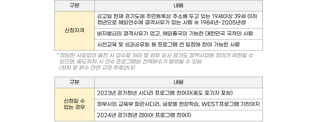 - 2024년 경기청년 사다리 프로그램에 최종합격하여 참여할 경우, 2024년 경기청년 갭이어 프로그램에는 중복참여할 수 없음(2023년 경기청년 갭이어 프로그램 참여자는 지원 및 참여가능)