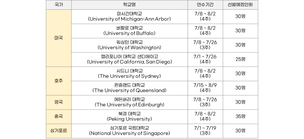 참고로, 총모집인원, 대학별 선발인원, 연수기간 등 변경이 될 수 있는 점 참고 바랍니다.