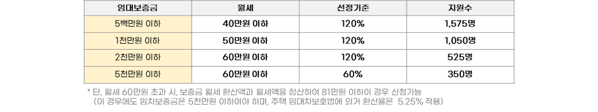 - 월세 범위에서 지원이 되며 임차보증금과 관리비는 제외하고 지원이 되는 부분입니다.
